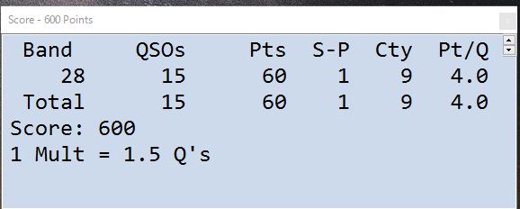 始めてARRL 10m CW部門に参加しましたが、コンデションが悪くて、また運用時間が短かったため、僅かな交信数です。 現在 ハイバンドのコンデションが非常に悪いですね。。。